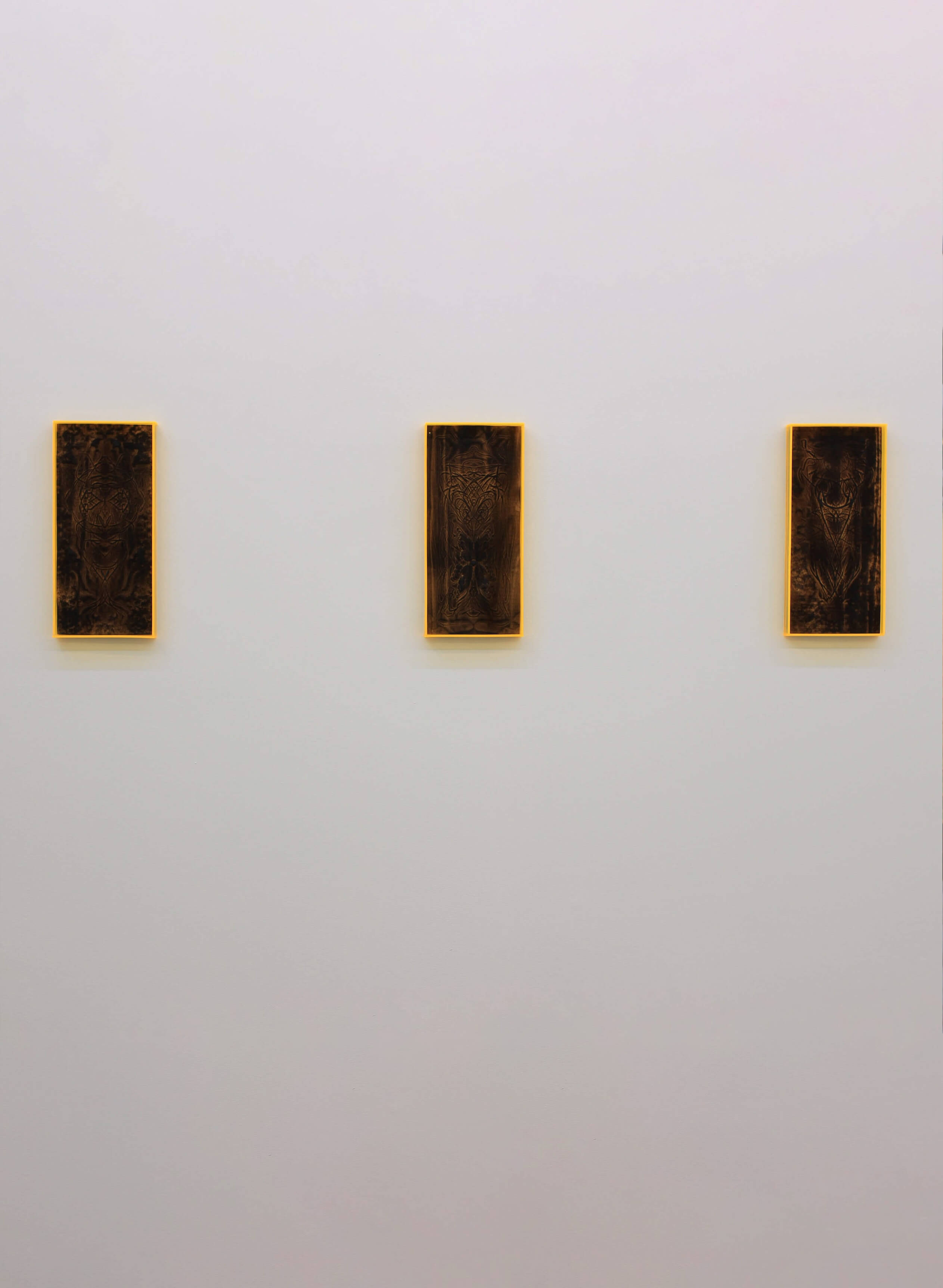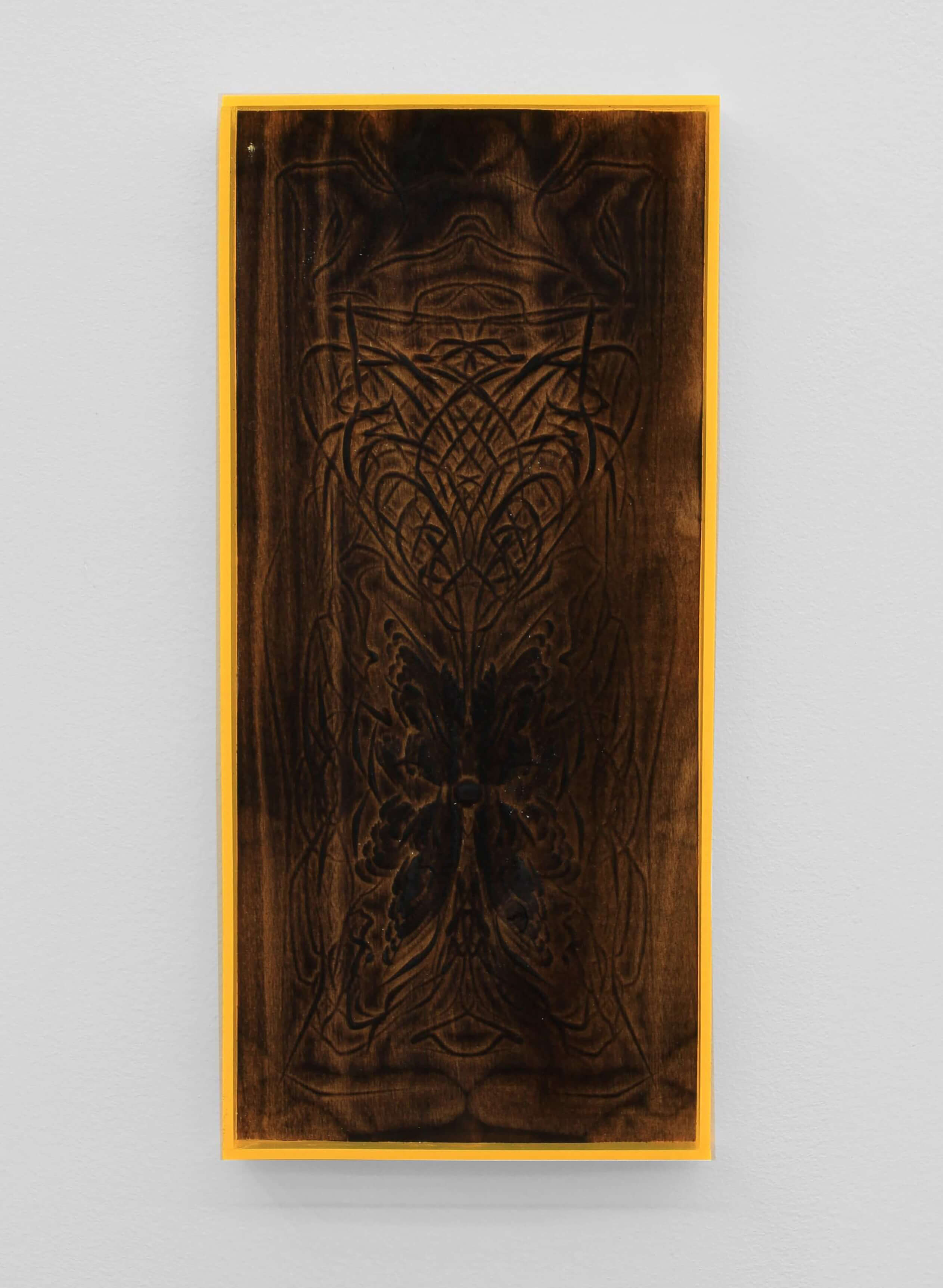Burned maple, fluorescent acrylic, cyanoacrylate glue.