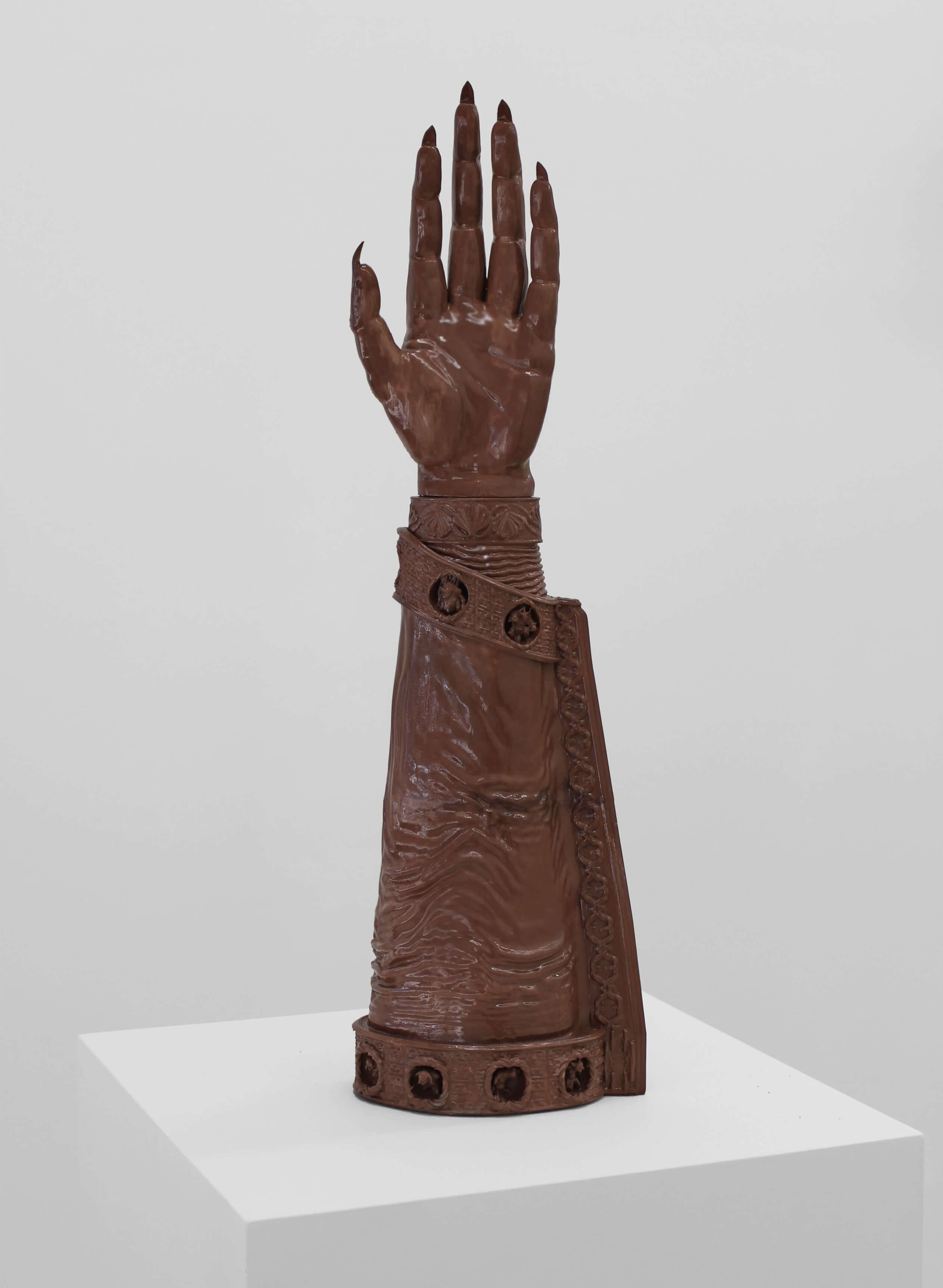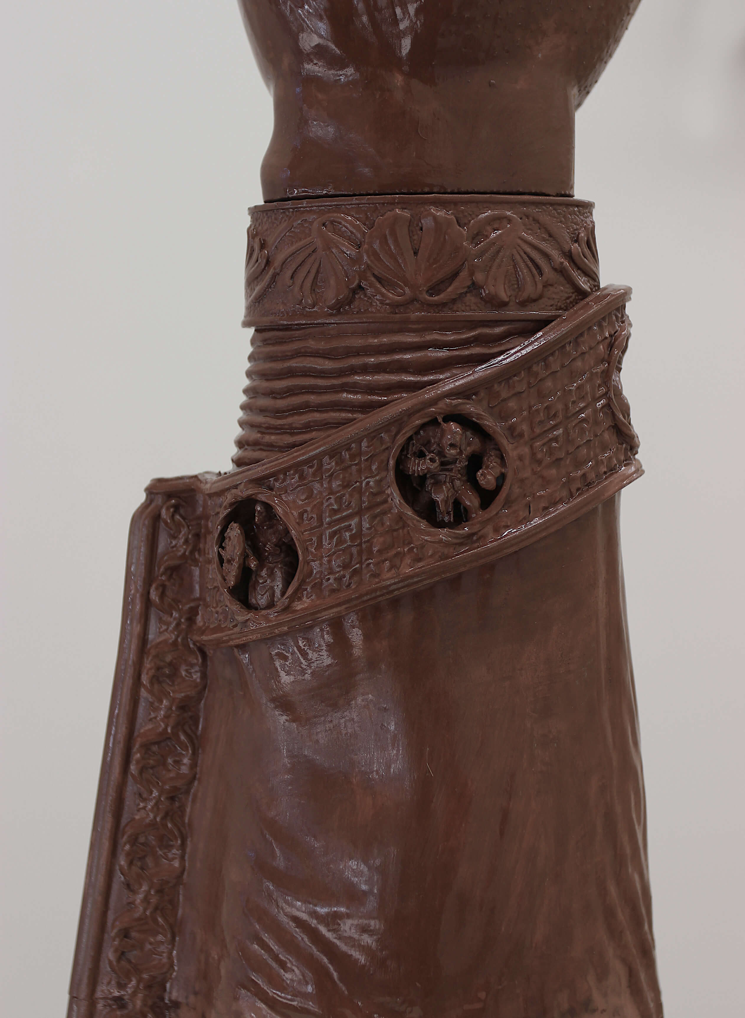 Soy based resin, water gilding media (individual serving dehydrated bone broth, french green cosmetic clay, cosmetic kaolin, rabbit skin glue granules, terracotta clay), shellac, cyanoacrylate glue, chicken bone sourced from 7/11, USG drywall filler, automotive filler primer.