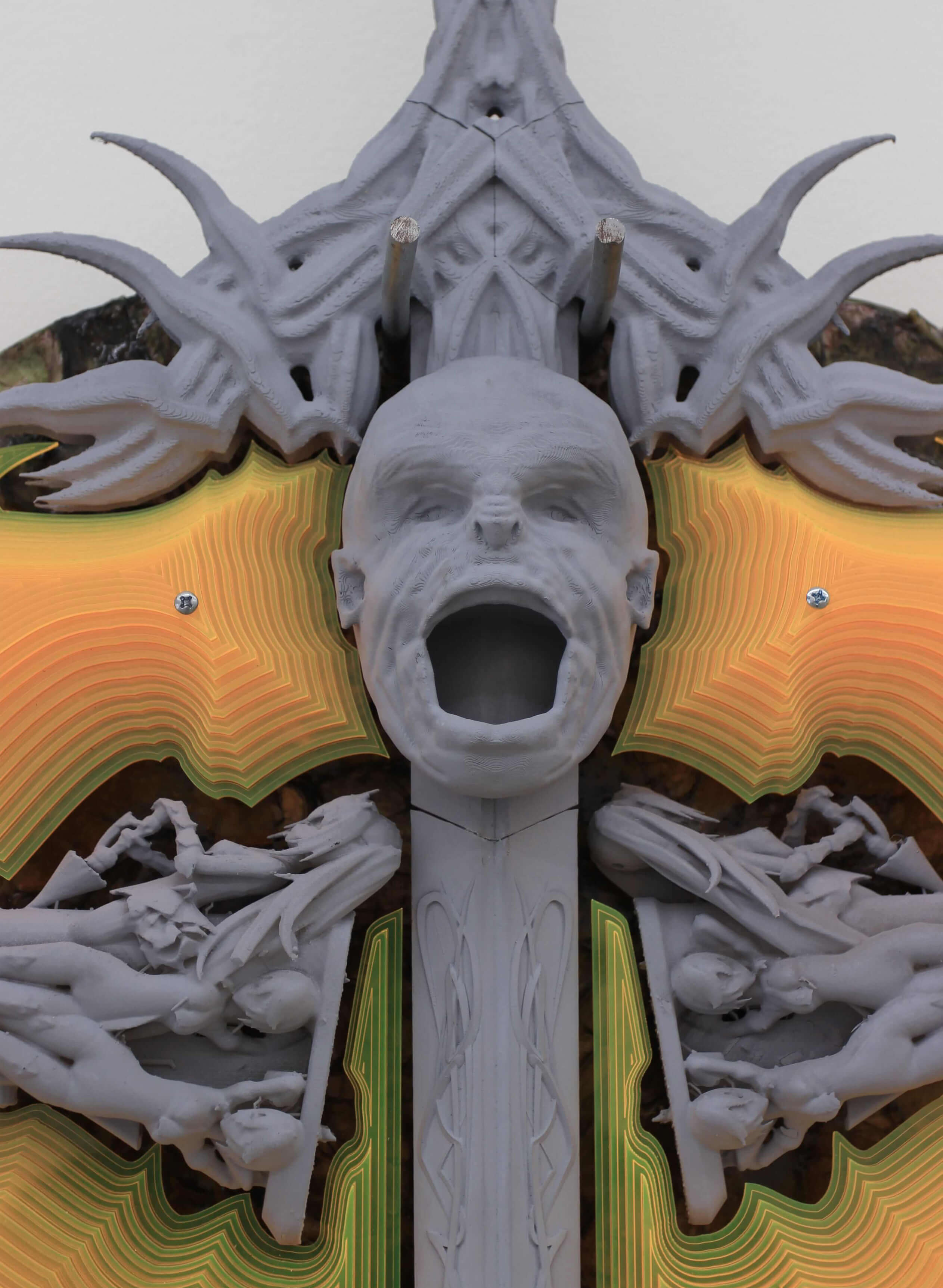 Soy based resin, PLA, fluorescent acrylic, MDF, 6-32 bolts, ATX motherboard standoffs, brass threaded inserts, custom machined steel hardware, prosthetic latex, acrylic paint, plywood.