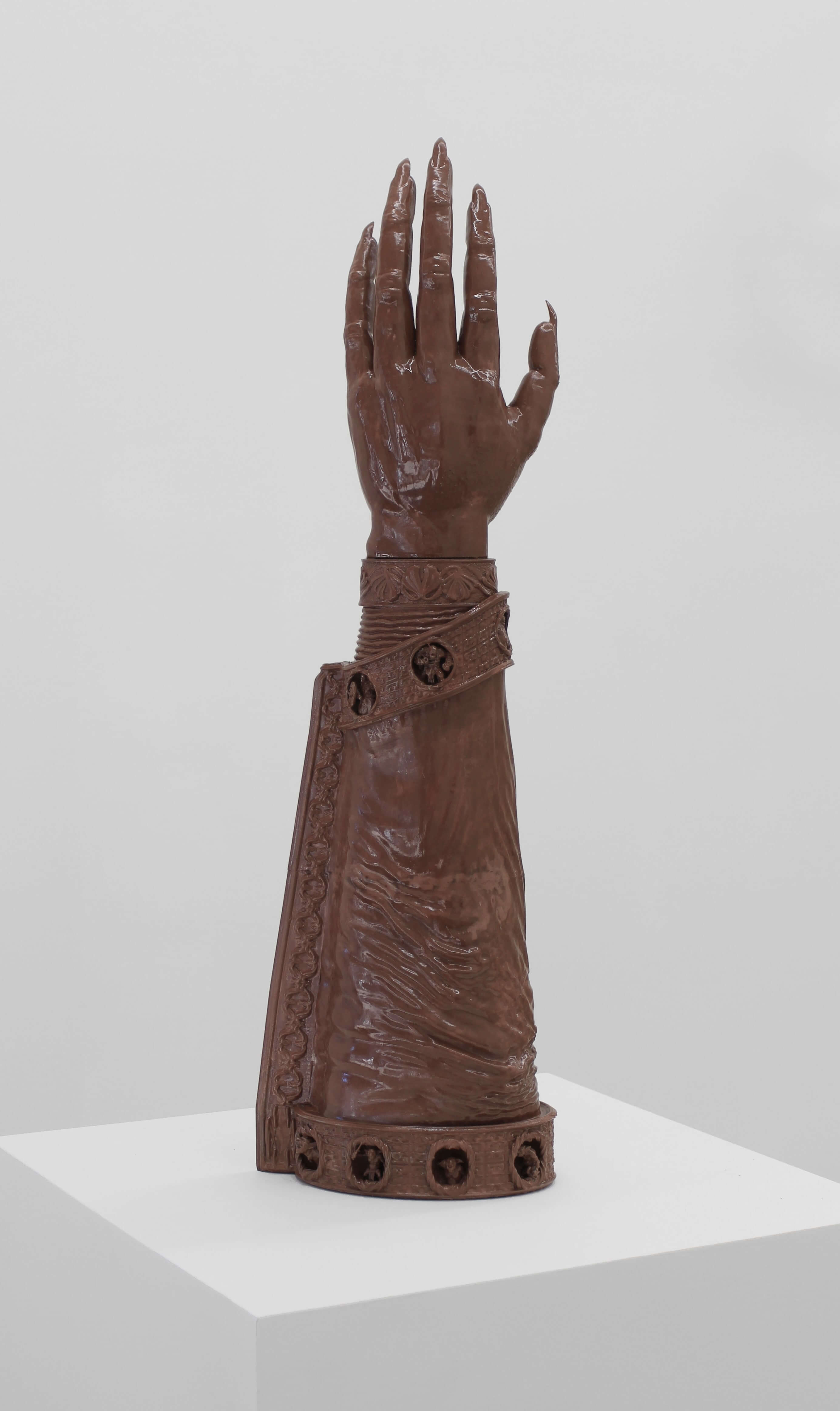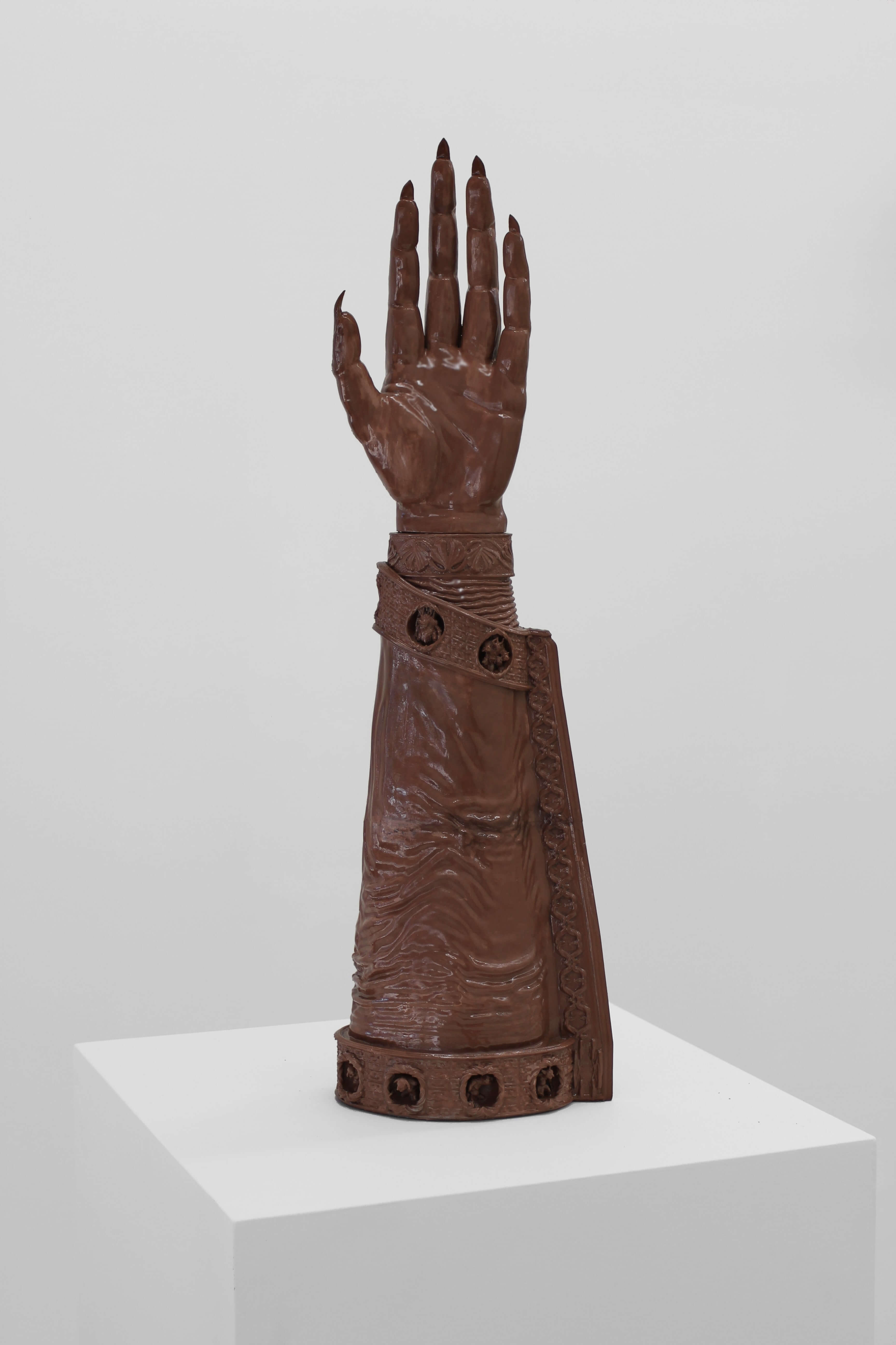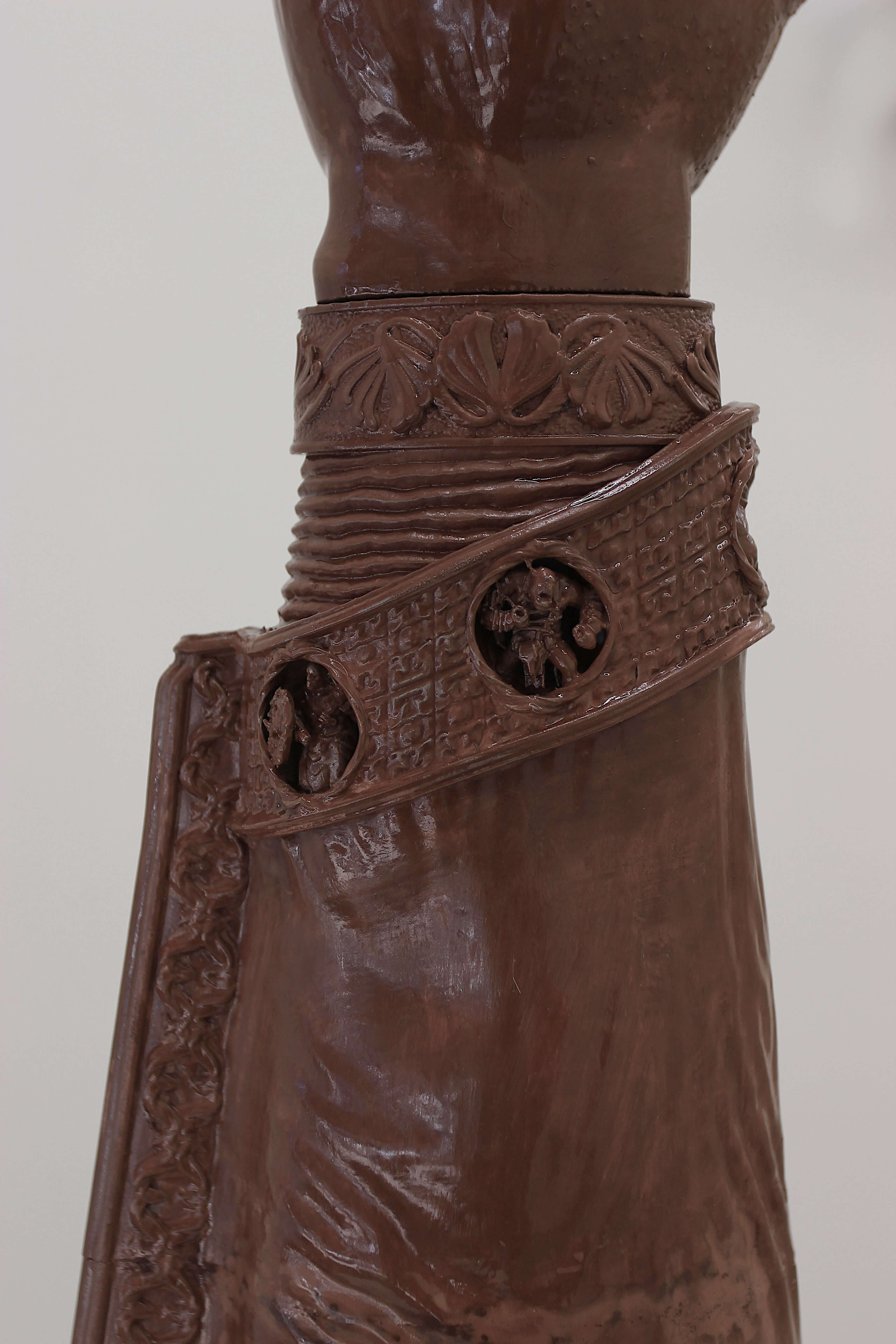 Soy based resin, water gilding media (individual serving dehydrated bone broth, french green cosmetic clay, cosmetic kaolin, rabbit skin glue granules, terracotta clay), shellac, cyanoacrylate glue, chicken bone sourced from 7/11, USG drywall filler, automotive filler primer.