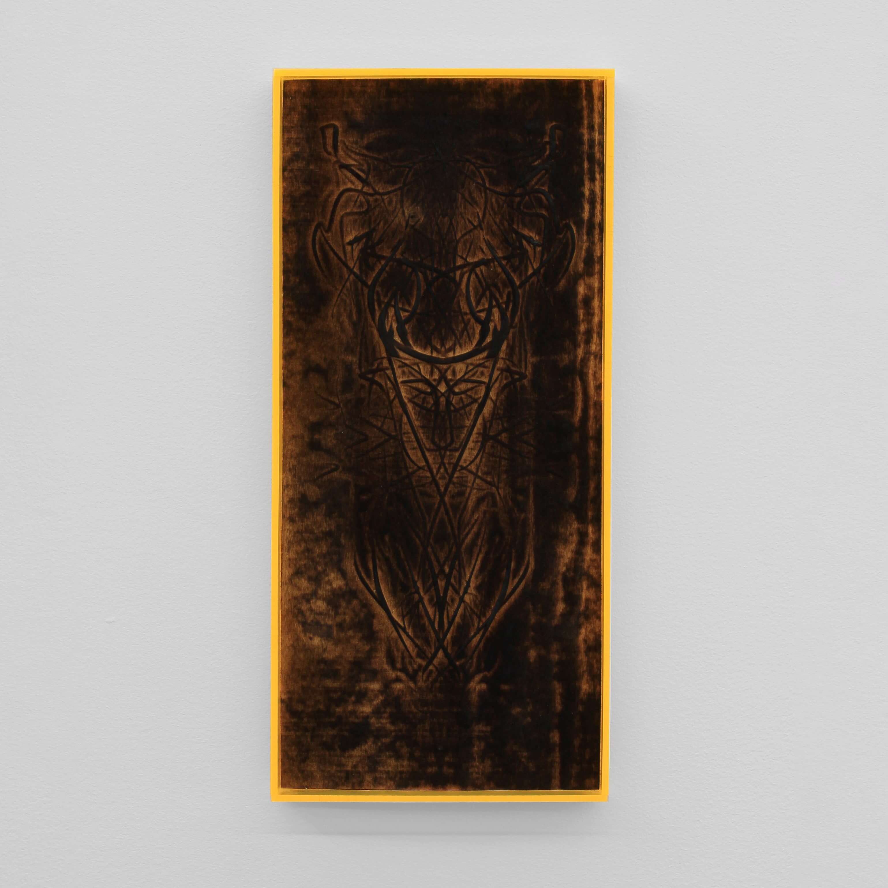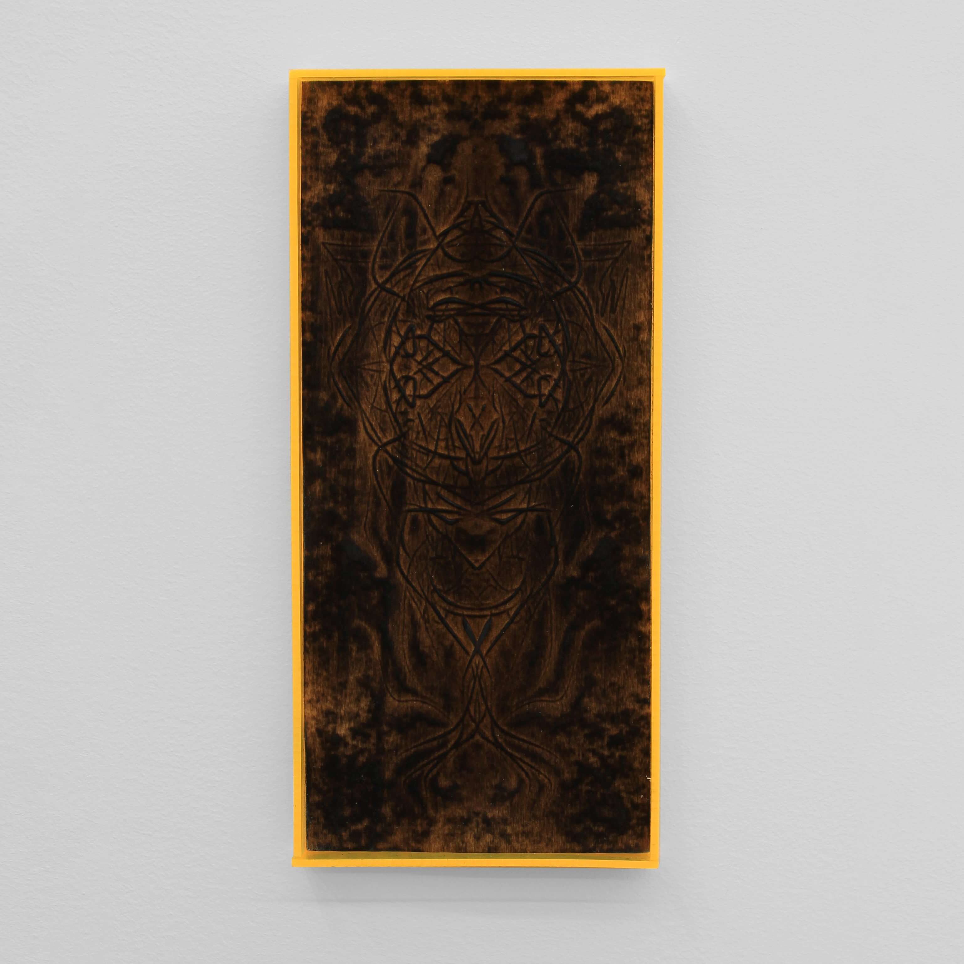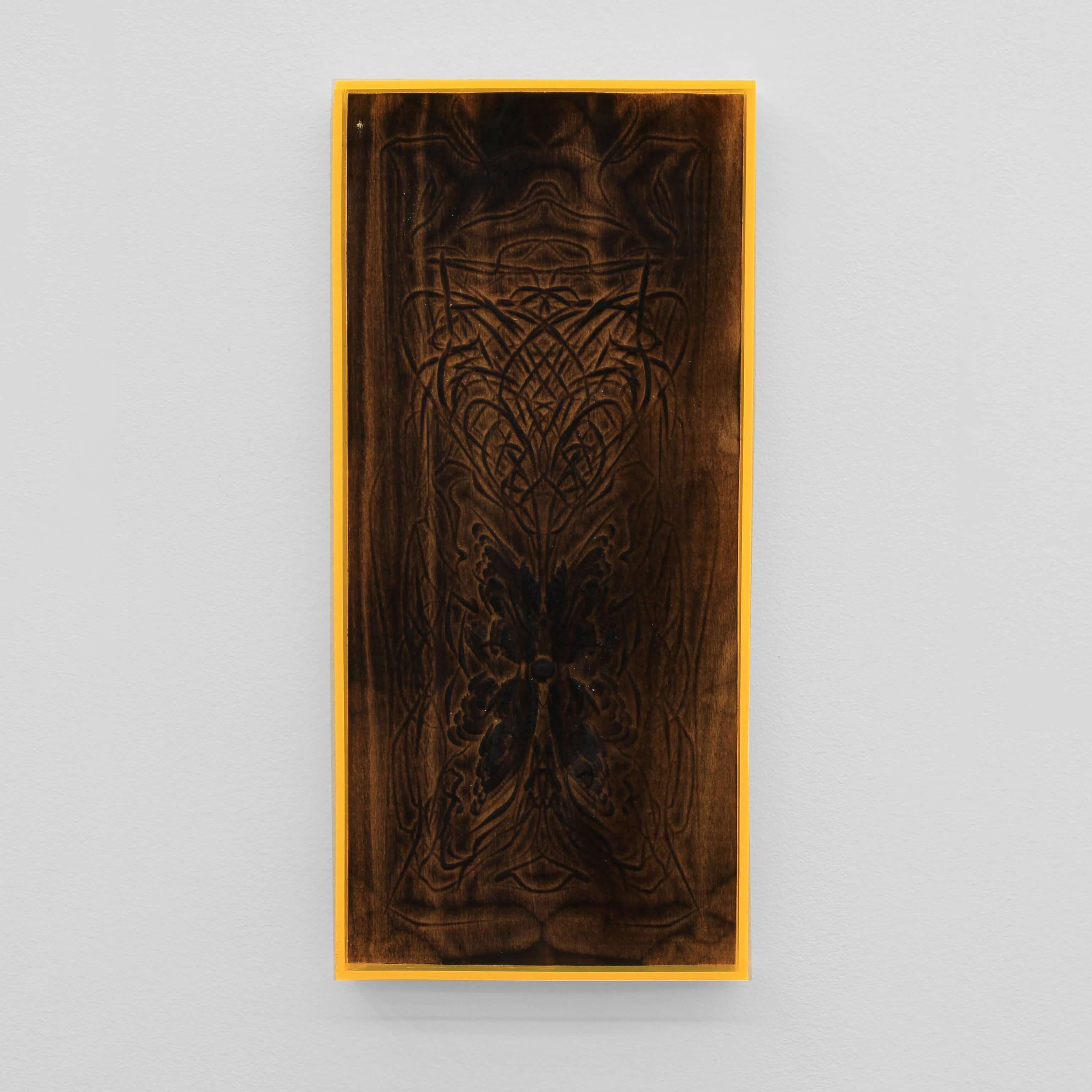 Burned maple, fluorescent acrylic, cyanoacrylate glue.